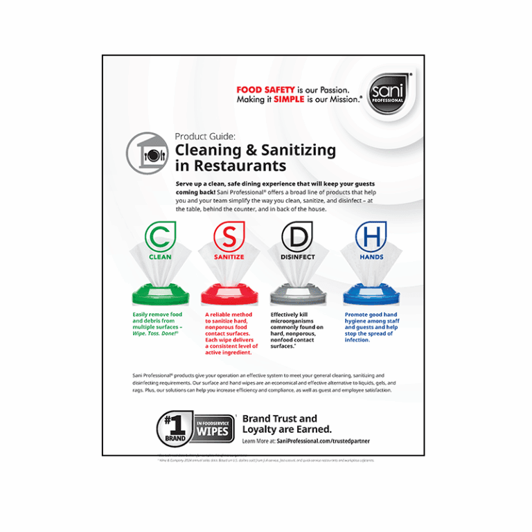 Maintaining a clean and safe dining environment is essential for protecting guests and ensuring compliance with health regulations. Our Foodservice in Restaurants Industry Guide explores how Sani Professional’s cleaning, sanitizing, and disinfecting solutions fit into your restaurant operations.